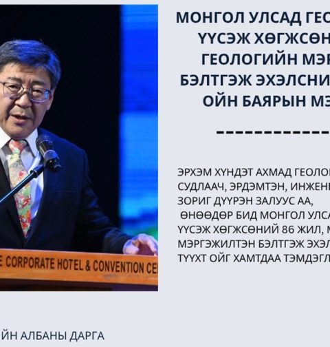 Эрхэм хүндэт ахмад геологичид, үе үеийн судлаач, эрдэмтэн, инженерүүд, салбарын урам зориг дүүрэн залуус аа,Өнөөдөр бид Монгол Улсад геологийн алба.